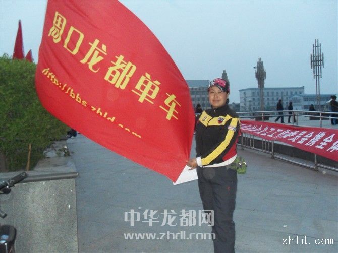 4月18日傍晚,一名網(wǎng)友把“周口龍都單車”旗幟插在五一廣場,為祈?;顒硬贾脠龅?。