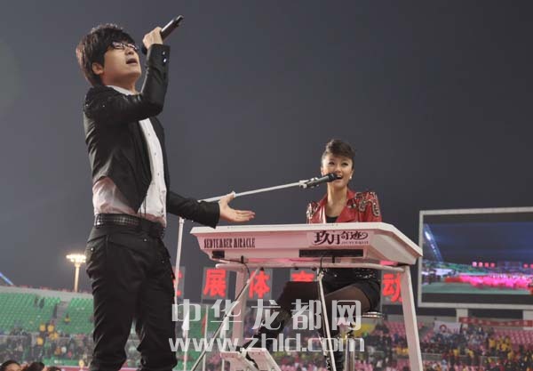 就在觀眾意猶未盡之時(shí),著名演唱組合“玖月奇跡”突然出現(xiàn)在表演場地上,引起觀眾一陣騷動(dòng)?!熬猎缕孥E”的女成員王小瑋在專用樂器“雙排鍵”上手腳并用,演奏出優(yōu)美樂曲的同時(shí),男歌手王小海飆起了高音,震驚全場,把現(xiàn)場氣氛又一次推向高潮。