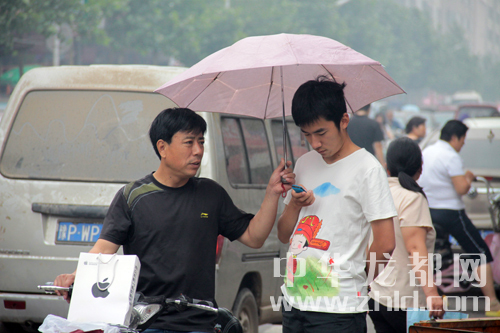 上午8點30分天空下起小雨一家長為考生撐起雨傘。