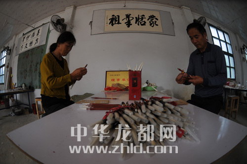 ????提起汝陽劉毛筆,劉四平滔滔不絕?!叭觋杽⒚P選料考究,兔毫的選擇標(biāo)準(zhǔn)是秋毫取健,取尖,春夏毫則不要;狼毫必須要到東北去采集過冬的黃鼠狼尾毛來制作?!闭勗掗g,劉四平順手拿起一支毛筆,說:“汝陽劉毛筆制作很精細(xì),主要工藝流程有:分毛-脫脂-去絨-裝毛-齊毛-墊毛-切毛-梳毛-修毛-成頭等128道工藝,成品具備尖、圓、齊、健‘四德’,軟硬適中的標(biāo)準(zhǔn);其外飾,尤其是筆桿的裝飾極為講究,根據(jù)筆的形狀和高、中、低檔的要求配之,既美觀又大方。”