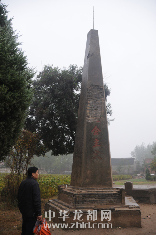????在秋雨中,我們走進(jìn)陵頭崗村北頭的普理小學(xué),這是所普及革命真理的紅色校園。在青松和古柏的映襯下,校園操場中央矗立的三崗革命根據(jù)地紀(jì)念塔顯得更加莊嚴(yán)肅穆,塔身正面刻寫著“為了革命事業(yè)的勝利,英勇犧牲的英雄們千古不朽”21個大字,塔身背面的字跡雖然已經(jīng)模糊,但仔細(xì)辨認(rèn)還能看到這樣一段話:“河南省老根據(jù)地建設(shè)委員會為了培養(yǎng)老區(qū)人民的后一代,使其繼承革命事業(yè)的優(yōu)良傳統(tǒng),成為社會主義的建設(shè)者和保衛(wèi)者,乃于一九五六年撥發(fā)款項修葺擴建三崗小學(xué),欣值落成用特志其端末,以資留念,時在一九五七年十月。”遺憾的是,由于年久失修,塔身西北側(cè)上半部已經(jīng)風(fēng)化,刻寫的“一切為了社會主義”8個大字只剩下“一”“會主義”4個字,覆蓋在塔身中部外層的水泥已經(jīng)脫落,露著磚塊。據(jù)69歲的村民侯民生介紹,1957年10月,普理小學(xué)從陵頭崗村舊址搬遷到此后進(jìn)行了擴建,不僅蓋起了當(dāng)時全縣一流的校舍,還在校園正中心建起了這座紀(jì)念塔。