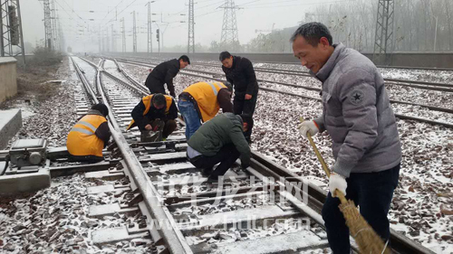 ????11月24日,我市迎來(lái)今冬第一場(chǎng)雪。為確保鐵路行車安全,漯阜鐵路有限責(zé)任公司組建黨團(tuán)員突擊隊(duì)清掃道岔積雪,涂油、噴灑防凍液,確保設(shè)備正常運(yùn)轉(zhuǎn),同時(shí)在客運(yùn)站臺(tái)鋪設(shè)地毯、防滑墊等,防止旅客摔傷。圖為突擊隊(duì)隊(duì)員清掃道岔積雪。