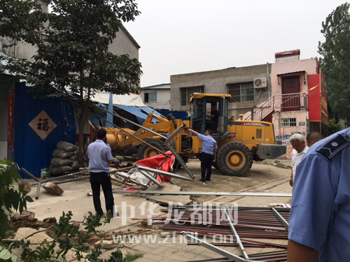 ????面對(duì)整治過(guò)程中不斷冒出的違章建筑物,小型鏟車已難以應(yīng)付一些困難和復(fù)雜的場(chǎng)面,城管隊(duì)員臨時(shí)抽調(diào)了一輛大型鏟車前來(lái)助陣。在五一南路麒麟建材市場(chǎng)附近,就有大大小小十多間違章房(棚)和多個(gè)非法廣告牌。城管隊(duì)員充當(dāng)搬運(yùn)工,不時(shí)進(jìn)進(jìn)出出,幫店主抬出全部物品后,鏟車上場(chǎng)輕輕一挑、一拉、一拽,一間間看似堅(jiān)硬牢固的簡(jiǎn)易房便應(yīng)聲倒下。