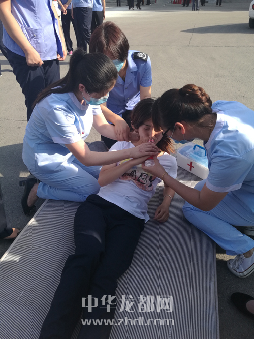 ????在模擬車站大廳發(fā)生火災的演練中,車站值班站長第一時間撥通119、120求救,并組織工作人員幫助旅客有序撤離。車站醫(yī)療搶救組對撤離到安全地帶的受傷旅客進行施救(如圖二)。大廳內(nèi)人員全部撤離后,救援人員手持滅火器迅速組織滅火(如圖三)。