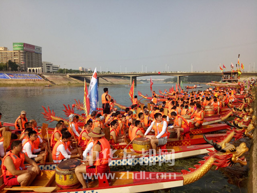 ????當(dāng)日9時(shí)許,位于周口市區(qū)中州大道橋旁的中華龍舟大賽基地鑼鼓喧天,人潮涌動(dòng),不少市民攜家?guī)Э谇皝碛^戰(zhàn)。河中,20多條龍舟整齊地排列在水面上(如圖),等待“點(diǎn)睛”時(shí)刻的到來。一點(diǎn)龍眼,風(fēng)調(diào)雨順、國泰民安……點(diǎn)睛人分別為龍舟“點(diǎn)睛”后,第三屆中華龍舟大賽正式拉開帷幕。