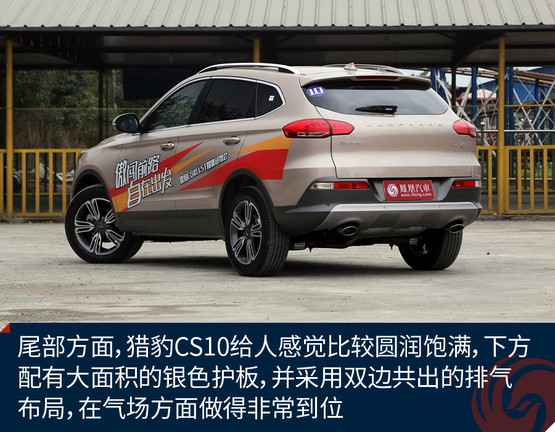 側(cè)面看過去,獵豹CS10采用一條剛勁十足的腰線從頭燈到尾燈,展現(xiàn)出了蓄勢待發(fā)的車身姿態(tài),同時鍍鉻窗框亮條的使用讓該車看上去更加豪華大氣。尾部方面,獵豹CS10給人感覺比較圓潤飽滿,下方配有大面積的銀色護板,并采用雙邊共出的排氣布局,在氣場方面做得非常到位。
