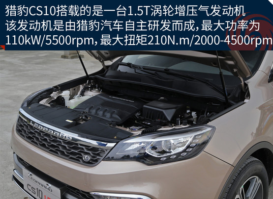 本次我們試駕的獵豹CS10搭載了一臺1.5T渦輪增壓氣發(fā)動機,最大功率為110kW/5500rpm,最大扭矩為210N.m/2000-4500rpm。傳動部分,與這臺發(fā)動機匹配的是5速手動與CVT無級變速箱,并采用前置前驅(qū)的驅(qū)動形式。
