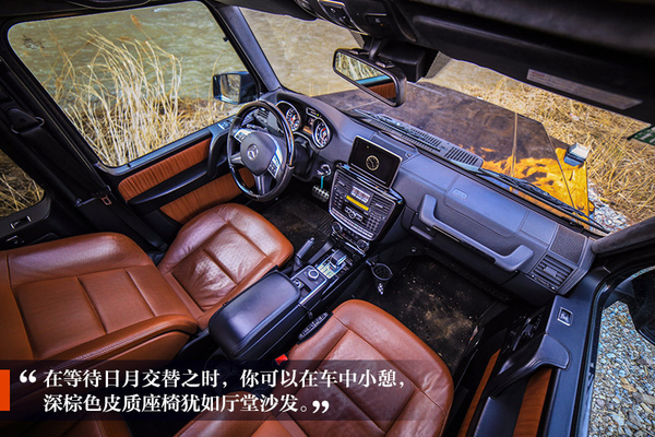 在等待日月交替之時(shí),你可以在車中小憩,方殼子造型的車體,像是一個(gè)移動的居所,G 63 AMG中的深棕色皮質(zhì)座椅,就好似廳堂中的沙發(fā),供人高談、辨析、訴情、吹煙。中控九宮格數(shù)字“點(diǎn)唱機(jī)”,不再選擇聒噪的887,而是從中播出歲月的聲音,流出時(shí)間的經(jīng)典,隨著天色變暗,內(nèi)心也趨于平靜。