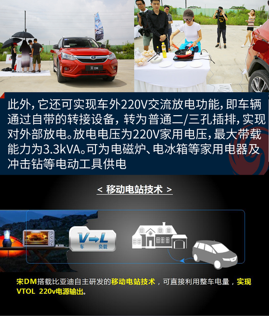 ????????宋DM可實現(xiàn)車外220V交流放電功能(VTOL),即車輛可通過自帶的轉(zhuǎn)接設備, 轉(zhuǎn)為普通二/三孔插排,實現(xiàn)對外部用電器放電。放電電壓為220V家用電壓,最大帶載能力為3.3kVA,給日常家用電器供電一點沒問題。