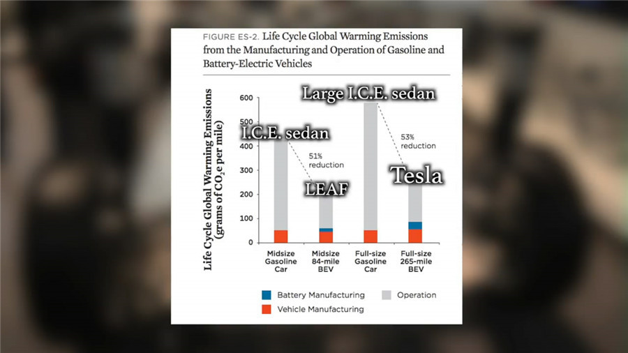 ????????但是如果算上在使用過程中產(chǎn)生的排放,在完整的使用周期中,電動車產(chǎn)生的總排放比內(nèi)燃機(jī)汽車就少了一半左右。