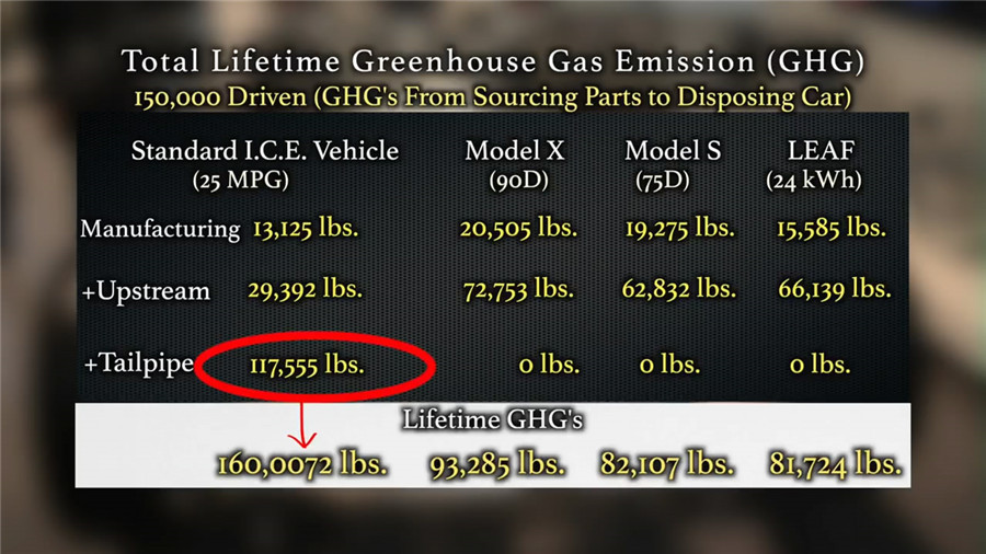 ????????這張表更加清晰,分別統(tǒng)計(jì)了普通內(nèi)燃機(jī)汽車(25MPG=百公里油耗9.4升)、特斯拉Model X 90D、Model S 75D和聆風(fēng)(電池容量24kWh)在車輛生產(chǎn),燃油/電能生產(chǎn)過程以及駕駛使用過程中的排放,可以看到,盡管電動車在車輛生產(chǎn)、電能生產(chǎn)過程中產(chǎn)生的排放更高,但行駛工程中的零排放仍然使其在整個生命周期中的排放更低。