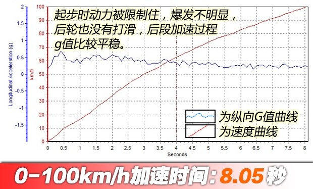????雖然可以關(guān)閉穩(wěn)定系統(tǒng),但感覺(jué)卻對(duì)發(fā)動(dòng)機(jī)輸出非常保守,變速箱也不允許拉到很高的轉(zhuǎn)速。起步后車(chē)輪沒(méi)有明顯滑動(dòng),說(shuō)明并沒(méi)有達(dá)到最佳輸出狀態(tài),最終成績(jī)?yōu)?.05秒,成績(jī)與老款車(chē)型有差距,略有遺憾。
