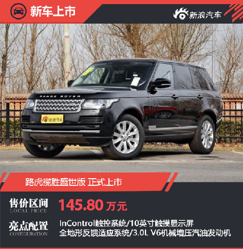 ????新浪汽車訊 今日,路虎宣布攬勝盛世版正式上市,指導(dǎo)售價為145.80萬元。新車即日起接受預(yù)定,并將于2017年11月6日正式到店銷售。從指導(dǎo)售價來看,攬勝盛世版將成為攬勝車系的入門車型。