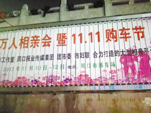 ????據(jù)了解,周口萬人相親會(huì)是由市委組織部青年工作辦公室、共青團(tuán)周口市委、市婦聯(lián)、周口報(bào)業(yè)傳媒集團(tuán)聯(lián)合主辦的大型相親平臺(tái)。為再一次給廣大消費(fèi)者搭建更好的選車、購車平臺(tái),周口報(bào)業(yè)傳媒集團(tuán)決定于11月10日至12日在市體育場隆重舉辦2017周口萬人相親會(huì)暨“雙十一”購車節(jié)。