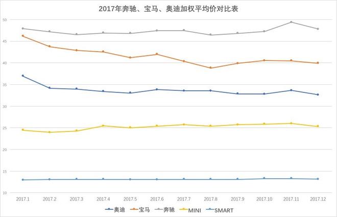 以官方披露的銷量口徑計(jì)算,奔馳(含smart)全年銷量為610,965輛,增長25.9%,成為中國市場首家銷量超過60萬輛的豪華車品牌,銷售總量名列第一;奧迪全年銷量為595,700輛,增長1.1%;寶馬(含Mini)全年銷量為594,388輛,增長15.1%。如果按單一品牌統(tǒng)計(jì),奧迪品牌銷量為595,700輛,寶馬品牌為56萬輛,奔馳品牌(含v級車)為587,868輛,奧迪品牌蟬聯(lián)2017年中國豪華車第一。