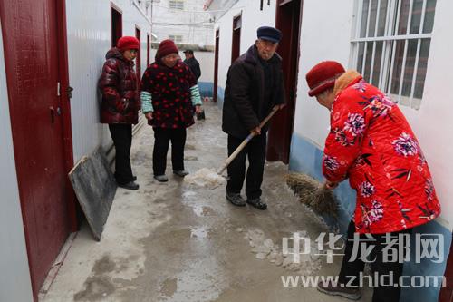 記者看到,一位老人正在用木棍敲打屋檐上垂下的“冰棍“,以免“冰棍”落下傷人,還有幾位老人在清掃剩下的一點(diǎn)點(diǎn)積雪,他們有說有笑,很是熱鬧,場面煞是溫馨。