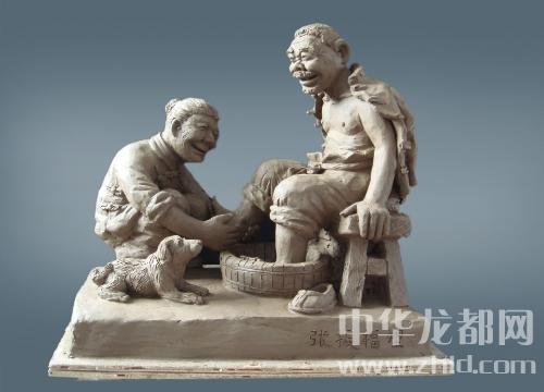 《老來(lái)伴》作品長(zhǎng)50cm、寬35cm、高46cm。作品表現(xiàn)的是:老漢干了一天的農(nóng)活兒回到家里,老婆用溫水給老漢洗洗腳,消除一天的疲勞,表達(dá)了老夫老妻恩恩愛(ài)愛(ài)、相濡以沫、白頭偕老。