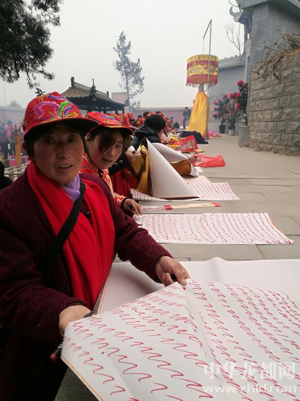 大霧的確延緩了香客的腳步,這也讓晚來的記者得以看到祭拜的盛景。女媧陵前,十幾名身著統(tǒng)一緞面紅襖,穿黑棉布鞋的女客正在結(jié)伴焚香祭拜,口音明顯和當?shù)厝瞬煌K齻兪菑木辔魅A300多公里的濮陽范縣、臺前縣來的,說是凌晨2時就起身出發(fā),大霧中不僅遭遇堵車,還迷了路,到女媧城都快8時了。她們這次一起來的有30多人,分乘4輛車。就像往常前來一樣,她們在女媧城要焚香、跪拜、“寫賬”(在紙上畫符,敬奉女媧的一種民間形式)、“守功”(在大殿靜坐,以示對女媧親近),直至下午方回?!拔覀兠磕炅鲁跻缓团D月初一都來,為啥?信奉女媧娘娘唄,不來不舒服。”其中一位孔姓香客告訴記者。