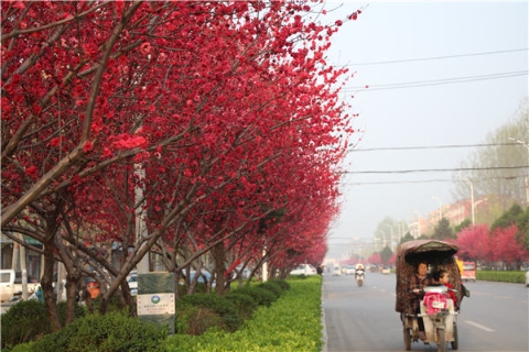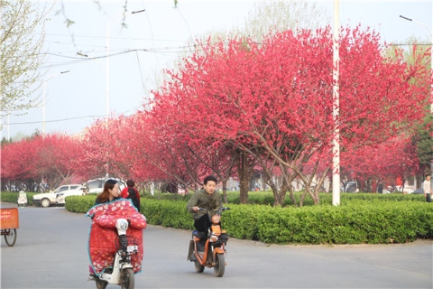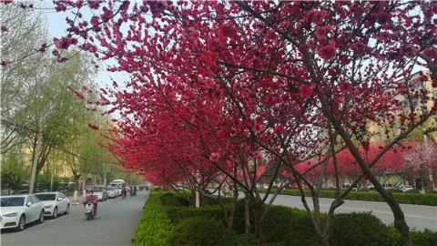 楊樹、垂柳、法桐,這是常見的綠化樹,可是你見過整條道路用桃樹做綠化的嗎?在周口市建設(shè)大道西段,長(zhǎng)達(dá)1公里的主干道兩側(cè)種滿桃樹。現(xiàn)在正值陽春三月桃花盛開,整條道路成了一片花的海洋,儼然是鬧市區(qū)里的世外桃源。