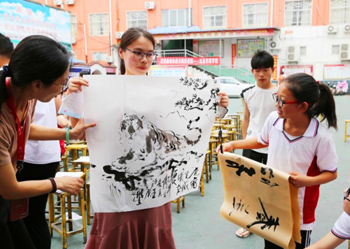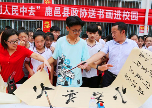 中華龍都網(wǎng)訊(周口報(bào)業(yè)全媒體記者 李瑞才 通訊員 孫廣合 胡洪濤)6月26日上午,鹿邑縣政協(xié)和縣文聯(lián)聯(lián)合開展“到人民中去”送書畫進(jìn)校園活動,組織10余位知名書畫家走進(jìn)校園,現(xiàn)場揮毫潑墨,為師生義寫字畫。
