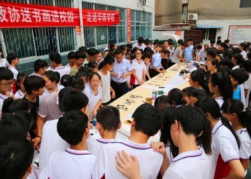 書畫家于連河、岳新華、夏有慶、王廣峰等人現(xiàn)場為師生書寫字畫近千幅,學(xué)生們圍在寫臺邊一邊求字畫一邊欣賞書畫技藝。“我們組織書畫家、藝術(shù)家到人民中去,為群眾送去藝術(shù)享受和書面精品,把精神食糧送給人民?!笨h文聯(lián)主席王亞飛告訴記者。