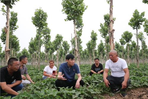 與前廟相鄰的大張村,是一個“天然大氧吧”。從大張村走出來的曹紅星在鄭州從事園林綠化多年,在朱口鎮(zhèn)黨委、鎮(zhèn)政府的支持和鼓勵下,他以1000元/畝的價格流轉(zhuǎn)了1000多畝土地,種植法桐、欒樹、國槐等綠化樹。有著豐富經(jīng)驗的曹紅星在種植綠化樹的同時,積極發(fā)展林下經(jīng)濟,在綠化樹下種植紅薯、大蒜等,有效提高了土地的利用率,經(jīng)濟效益顯著提高。“平時,綠化林地除草、抗旱、施肥需要用工,收種紅薯、大蒜等也需要用工,用工時貧困戶優(yōu)先。只要有勞動能力,來這里就能掙錢?!辈芗t星說,林業(yè)經(jīng)濟的快速發(fā)展為鄉(xiāng)親們脫貧致富提供了保障。