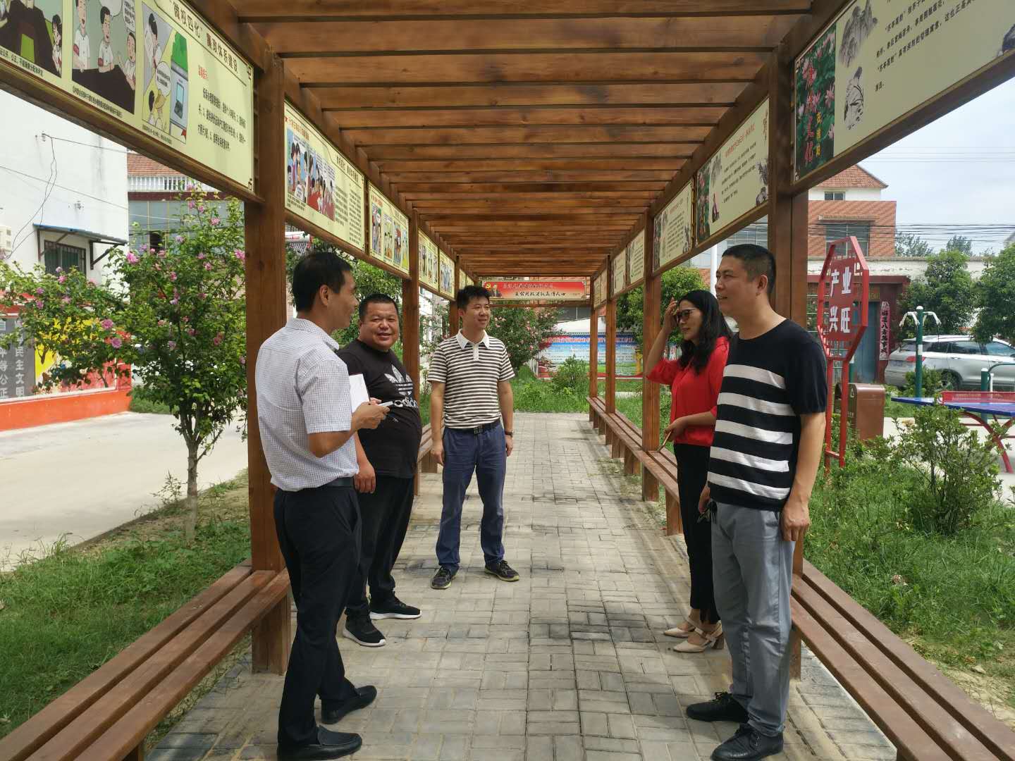 一條干凈的水泥路從村子中間橫穿而過,路兩側和村民房前屋后的大葉女貞流綠滴翠,木槿花開正盛,花朵壓彎了枝條,一面面文明禮讓、孝親敬老、鄰里和睦、移風易俗、反腐倡廉的文化墻,畫面生動、形象,讓人忍不著駐足觀看,社會主義核心價值觀宣傳處處可見。