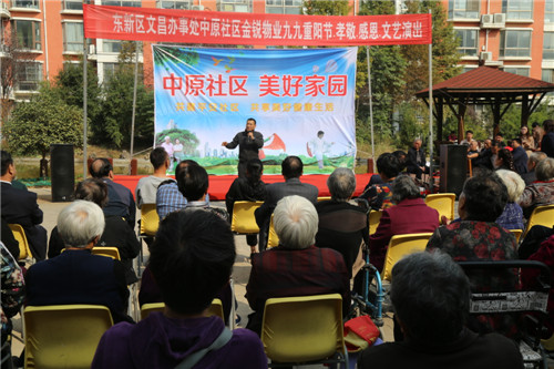 金秋十月,菊花飄香。10月17日重陽節(jié)當天,東新區(qū)中原社區(qū)攜同金銳物業(yè)在該社區(qū)組織開展了“擁抱新時代 歡度重陽節(jié)”文藝演出活動。東新區(qū)社會事務局局長朱放哲,房屋征收中心主任閆國政,文昌辦事處主任李向峰,國庫支付中心副主任科員齊孟磊,文昌中學副校長康瑞玲參加活動。