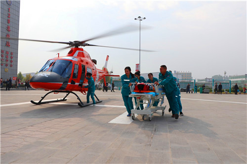 30分鐘后,救援直升機(jī)穩(wěn)穩(wěn)降落太康縣人民醫(yī)院停機(jī)坪,早已在此等候的醫(yī)院醫(yī)護(hù)人員迅速將患者抬下飛機(jī),送往重癥監(jiān)護(hù)室搶救。從接到求救電話到救援結(jié)束,整個(gè)過程共用時(shí)30分鐘。
