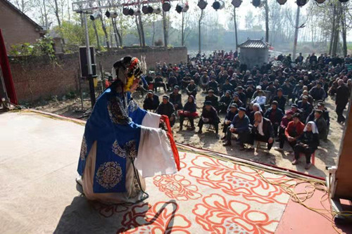 11月3日上午,記者在平店鄉(xiāng)吳吉屯村看到,剛剛落成的村室門(mén)前搭建了一個(gè)大舞臺(tái),洛陽(yáng)市的一家豫劇團(tuán)正在表演精彩的古裝戲曲,舞臺(tái)前坐滿了村民(如圖)。