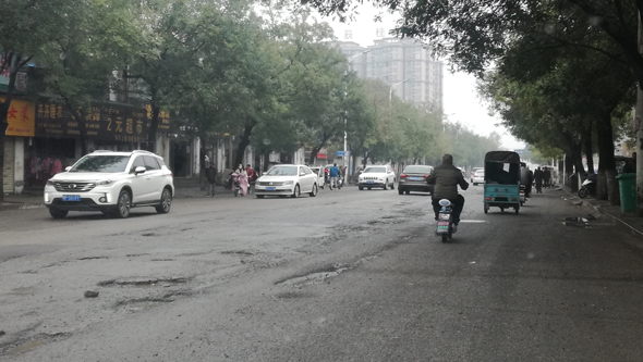 11月8日,記者現(xiàn)場(chǎng)采訪發(fā)現(xiàn),中州大道和人和街交叉口以北路段,路面瀝青剝離脫落、布滿大大小小的坑,碎石子散落滿地,車輛經(jīng)過(guò)時(shí),都不得不減速繞行。