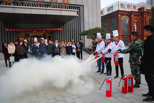 在培訓(xùn)現(xiàn)場,為更好地將學(xué)到的知識與實踐相結(jié)合,大隊宣傳人員組織參訓(xùn)人員開展了實地滅火消防演練,酒店全體員工分批次輪番上陣,通過使用滅火器及時迅速地撲滅火災(zāi)操練,提高參訓(xùn)人員正確規(guī)范使用滅火器材的能力,達到了良好效果。