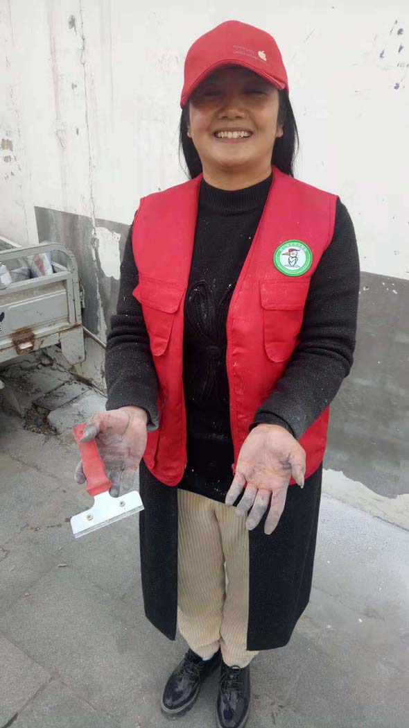 周口市啄木鳥志愿者服務工作委員會臨時黨支部書記、周口市慈孝文化促進會會長孫彩云更是不怕臟,不怕累,連個手套都不帶,直接用雙手拿著鏟刀或者抹布清理墻上的小廣告,最后弄得雙手和滿身都是污漬?!盀榱宋覀兊某鞘懈?,作為一名志愿者,就應該不怕累,不怕苦?!?/p>