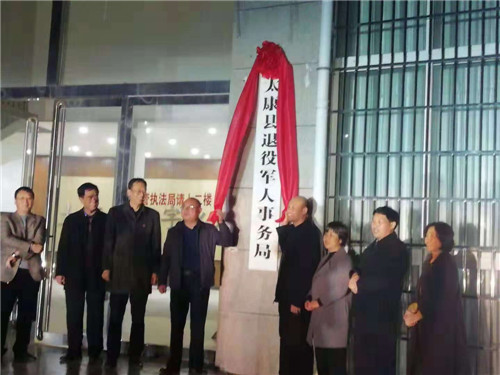 11月27日,太康縣退役軍人事務(wù)局掛牌成立。縣委常委、常務(wù)副縣長張保華,縣委常委、副縣長韓維俊,縣政協(xié)副主席、縣民政局局長劉鳳芹出席揭牌儀式??h編辦主任毛雙龍、縣退役軍人事務(wù)局干部職工參加揭牌儀式。