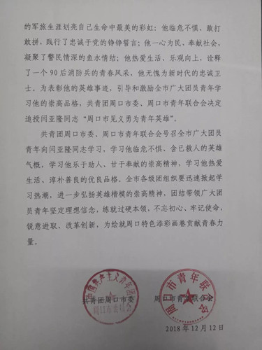 閆亞隆同志被追授“周口市見義勇為青年英雄”榮譽稱號