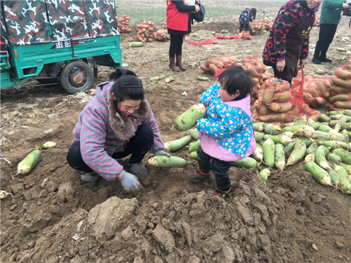 走在淮陽縣劉振屯鄉(xiāng)張老家村的田間地頭,記者看見劉玉梅正將蘿卜從地里扒出來裝車,她的小侄女也幫起忙來,吃力地抱起了一個大蘿卜。 記者 王凱 攝