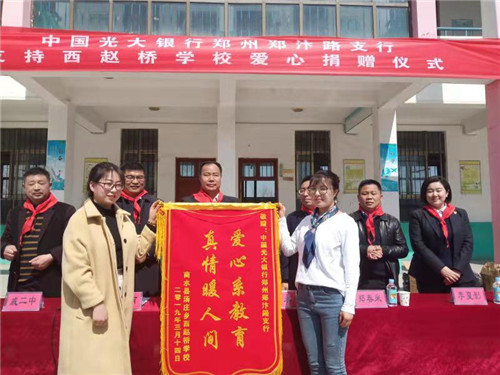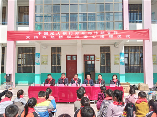 3月14日上午,陽(yáng)光明媚,春意盎然。中國(guó)光大銀行鄭州鄭汴路支行向商水縣湯莊鄉(xiāng)趙橋?qū)W校愛(ài)心捐贈(zèng)儀式在趙橋?qū)W校內(nèi)舉行。河南省委組織部駐西趙橋村第一書(shū)記楊永,商水縣教體局負(fù)責(zé)人鄭春來(lái)、湯莊鄉(xiāng)黨委書(shū)記潘建甫等出席捐贈(zèng)儀式。