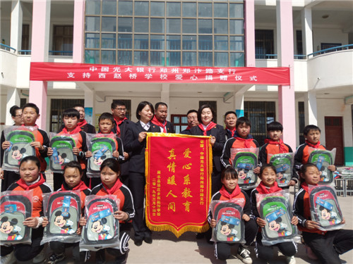 捐贈(zèng)儀式上,鄭汴路支行行長(zhǎng)苗長(zhǎng)海一行向趙橋?qū)W校捐贈(zèng)文具袋50只、書(shū)包50個(gè)、跳繩50根、板球拍50對(duì)、熱水袋50只、圍巾50只、跳棋50盒、沙包200個(gè)。苗長(zhǎng)海表示,光大銀行鄭州鄭汴路支行會(huì)一如既往的積極響應(yīng)黨中央脫貧攻堅(jiān)的重大部署,與省、市、縣、鄉(xiāng)結(jié)合繼續(xù)開(kāi)展形式多樣的愛(ài)心扶貧等公益活動(dòng)。他希望趙橋?qū)W校要運(yùn)用好捐贈(zèng)的學(xué)習(xí)、生活、體育用品,同時(shí)勉勵(lì)孩子們一定要好好學(xué)習(xí)、將來(lái)回報(bào)社會(huì)各界的關(guān)愛(ài)和支持。