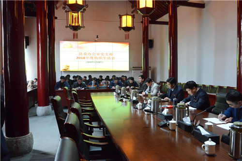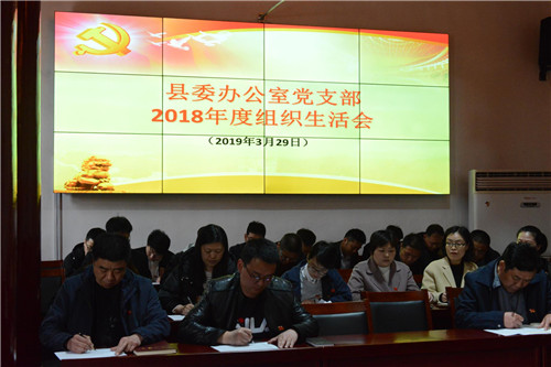 3月29日下午,鹿邑縣委辦公室黨支部召開2018年度組織生活會并開展民主評議黨員活動??h委書記梁建松,縣委常委、辦公室主任宋濤以一名普通黨員身份參加會議??h委辦公室機(jī)關(guān)全體同志參加會議。
