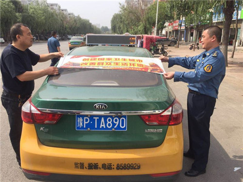 由區(qū)五城聯(lián)創(chuàng)指揮部牽頭,組織區(qū)城管局、區(qū)交通運(yùn)輸局等職能部門,利用城管執(zhí)法車輛、環(huán)衛(wèi)保潔車輛、交通執(zhí)法車等,統(tǒng)一張貼宣傳標(biāo)語(yǔ)進(jìn)行宣傳。日出動(dòng)各類宣傳車輛109輛。區(qū)五城聯(lián)創(chuàng)指揮部辦公室會(huì)同區(qū)交通運(yùn)輸局在中心城區(qū)出租車上統(tǒng)一張貼創(chuàng)衛(wèi)宣傳標(biāo)語(yǔ)和禁煙標(biāo)志,累計(jì)張貼出租車600余輛。多種載體宣傳。利用車體標(biāo)語(yǔ)、車載音響、大喇叭、出租車頂燈等載體,大密度宣傳創(chuàng)衛(wèi)標(biāo)語(yǔ)口號(hào),播放統(tǒng)一灌制的創(chuàng)衛(wèi)宣傳音頻。