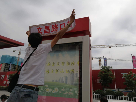 5月20日,在大慶路與文昌大道交叉口北側路西,市公交總公司安排人員在一些沒有名字的站牌前貼站名,方便市民乘坐公交車,助力我市“創(chuàng)衛(wèi)”工作。 記者 凡留威 攝