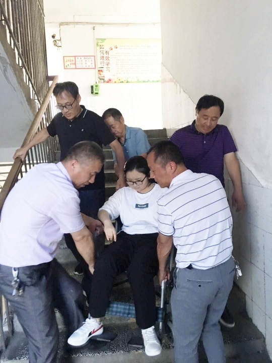 “考慮到她行動不便,我們適當?shù)卣{整了桌子之間的距離?!绷_明中表示,兩天來,晉淼在實驗中學考點服務工作人員的幫助下,從一樓抬進三樓考場。每場考場結束后,考點工作人員又把她從三樓抬下來,推到家長身邊。