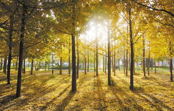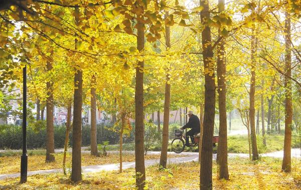 近日,周口市經(jīng)濟(jì)開發(fā)區(qū)人民廣場(chǎng),金黃色的楊樹葉在陽(yáng)光照耀下熠熠生輝,給城市增添一抹亮色。張振海 攝