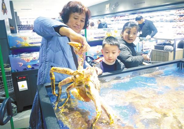 1月20日,一位市民在超市內(nèi)選購海產(chǎn)品。 記者 孫安平 攝