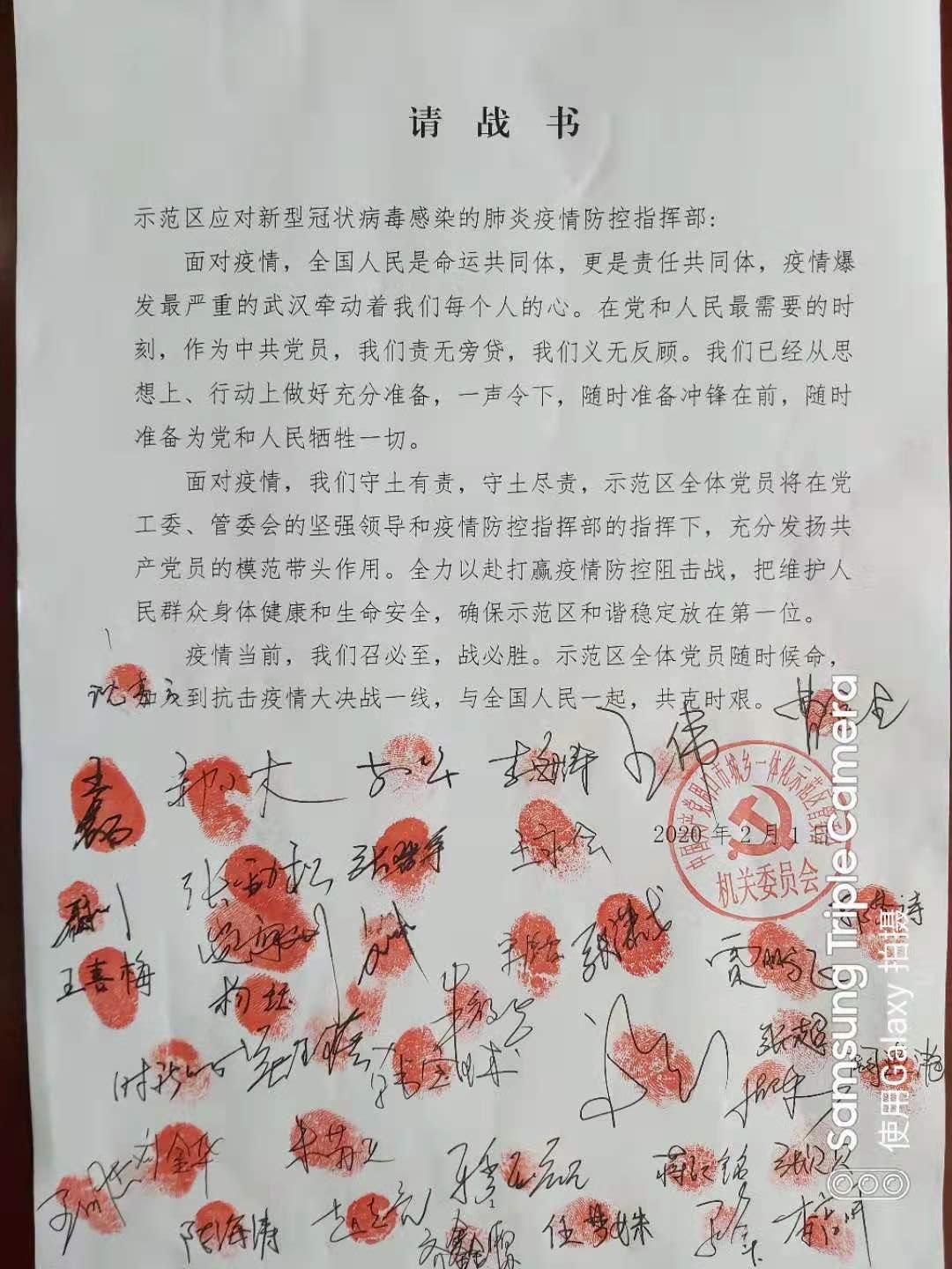 為了能到戰(zhàn)“疫”一線,示范區(qū)廣大黨員干部紛紛簽下“請戰(zhàn)書”,自愿要求加入到抗擊新型冠狀病毒感染的肺炎疫情戰(zhàn)斗中去?!罢垜?zhàn)書”上,他們紛紛按下鮮紅的指印,在指印下面,是每個黨員堅定的簽名,從這些指印和簽名可以看出每個黨員堅定的黨性和為了抗擊疫情大無畏的英雄氣概。