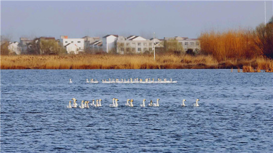據(jù)在淮陽龍湖北岸疫情卡點(diǎn)值守的安保人員王寶峰介紹,除了這一批50多只白天鵝來龍湖歇腳外,幾天前的2月18日,還有100多只白天鵝在太昊陵前廣場上空盤旋一圈后飛到了龍湖,在龍湖停留一天后向北方遷徙了。