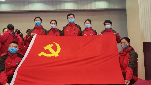 3月19日,周口援鄂醫(yī)療隊(duì)周口市中心醫(yī)院祁文麗、徐貴琴、解玉東、王亞麗、王玉才、王冰清6名隊(duì)員,站在鮮紅的黨旗面前莊嚴(yán)宣誓志愿加入中國共產(chǎn)黨。