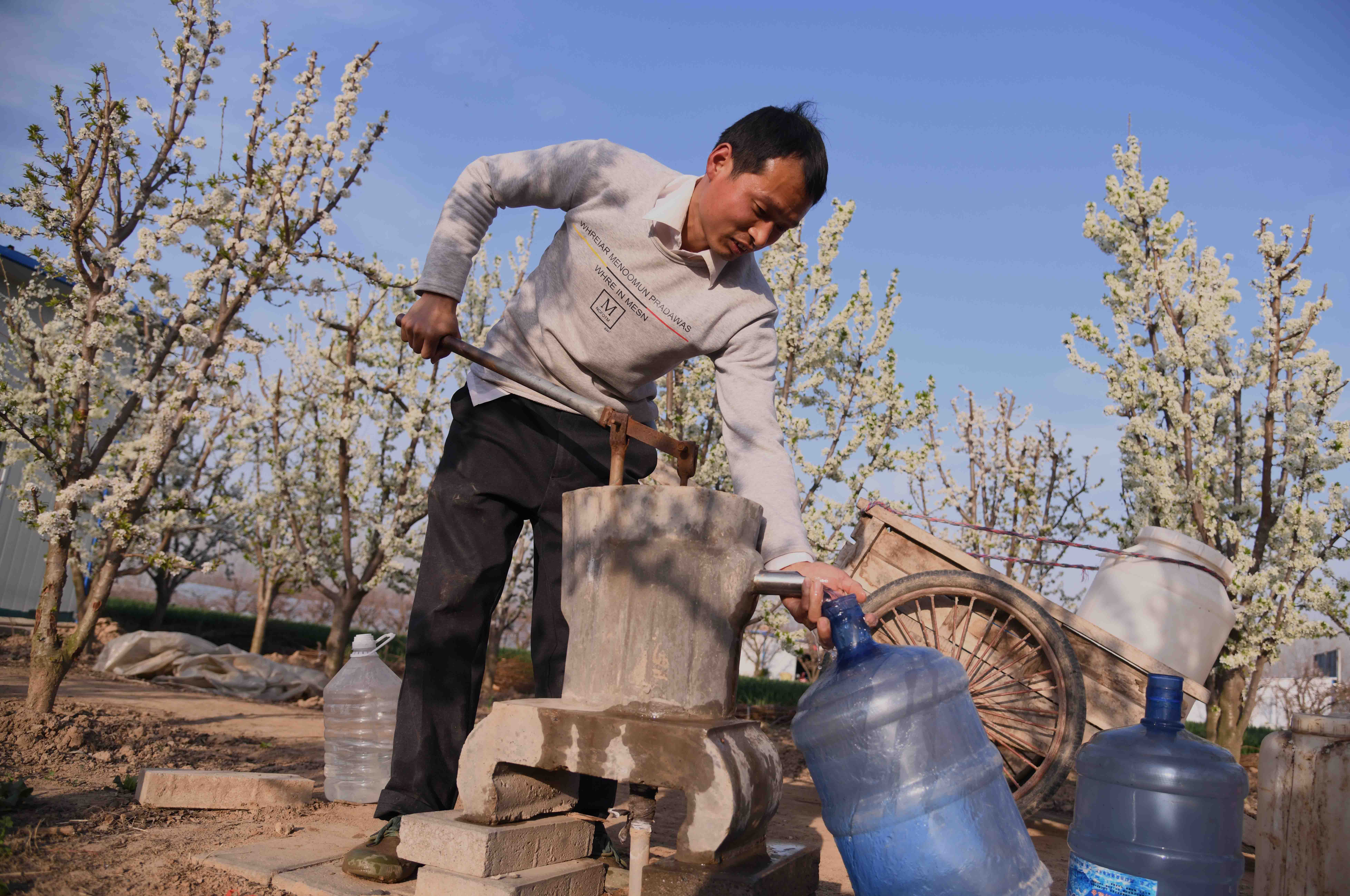 記者在一家果農(nóng)的果園里看到,果園在春陽下,李子花滿園濃放,滿樹花朵潔白如玉,芳香四溢,宛如置身人間仙境。果農(nóng)正忙著為果樹澆水,侍弄新栽的果苗。何莊村果園有三四百畝,種植有桃樹、蘋果樹、梨樹、李子樹、柿樹等,是附近有名的果樹種植村,成為村里的重要副業(yè),每年夏秋季節(jié),這里瓜果飄香,吸引很多城里人和附近村民前來購買。