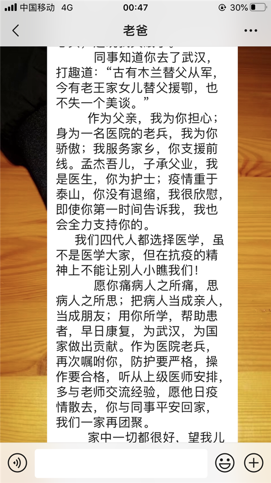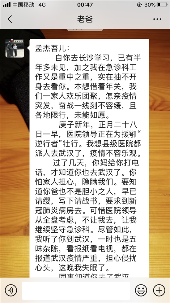 作為父親,我為你擔(dān)心;身為一名醫(yī)院的老兵,我為你驕傲;我服務(wù)家鄉(xiāng),你支援前線。孟杰吾兒,子承父業(yè),我是醫(yī)生,你為護(hù)士;疫情重于泰山,你沒有退縮,我很欣慰,即使你第一時(shí)間告訴我,我也會(huì)全力支持你的。
