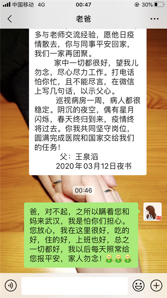 3月21日,周口援鄂醫(yī)療隊(duì)出征滿一月。當(dāng)晚,王泉滔通過微信又鄭重給女兒說下這番話:一晃你在武漢一個(gè)月了,我和家人從你去武漢的擔(dān)心到現(xiàn)在的放心,這是國(guó)家給予我們的安心。農(nóng)民把地種好,教師把學(xué)教好,士兵把國(guó)門守好,醫(yī)護(hù)把病治好,都是自己的使命,更是自己的初心。人人懷揣私字,社會(huì)必?cái)?,遭殃的終歸眾人;眾人心懷天下,萬物皆勝,受益的定是人人??吹胶幽喜糠衷踽t(yī)療隊(duì)從武漢凱旋歸來,雖然沒有你的身影,但是我們很高興,說明武漢的疫情已得到控制,我和家人一起期盼你早日歸來。但是還是要再次叮囑你,不要因?yàn)橐咔榈搅俗詈蠖潘删?,上下班路上注意安全,穿脫防護(hù)服不能有一絲懈怠,時(shí)刻保持警醒。年前你當(dāng)了姑姑,雖然還沒有見到你侄子,但他和家人共同期待你平安回來。吾兒加油!